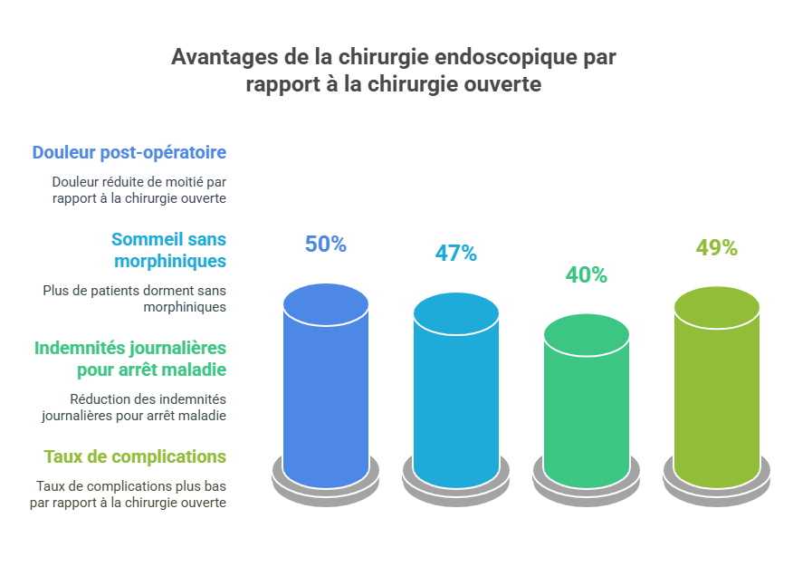 Moins de douleurs post-opératoires, récupération plus rapide, cicatrice minimale, et faible perte sanguine.
