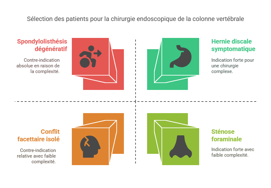 Le succès d'une chirurgie endoscopique dépend avant tout de la sélection du patient. Un disque trop calcifié, une sténose associée à un glissement vertébral avancé ou une scoliose rigide changent la donne : dans ces situations, une micro-décompression hybride ou une fusion ciblée sera plus sûre. Chaque dossier est donc revu en réunion de concertation pluridisciplinaire par un neuroradiologue, un neurochirurgien et un orthopédiste. Nous utilisons aussi un algorithme d'intelligence artificielle qui mesure automatiquement la surface canalaire et l'angle de migration discale pour prédire la faisabilité endoscopique avec une fiabilité de quatre-vingt-quatorze pour cent.