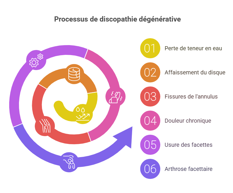 Processus : La cascade dégénérative commence par une perte de la teneur en eau du nucleus pulposus, qui perd ses propriétés d'amortisseur. Le disque s'affaisse, perdant de sa hauteur. L'annulus fibrosus, soumis à des contraintes anormales, se fissure.1