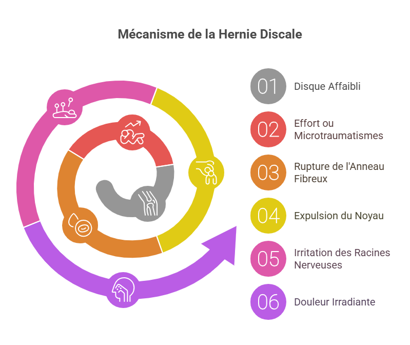 Mécanisme : À la faveur d'un effort ou de microtraumatismes répétés sur un disque déjà affaibli, l'anneau fibreux (annulus) se rompt. Le noyau gélatineux (nucleus) est alors expulsé à travers cette brèche et fait saillie dans le canal rachidien.3