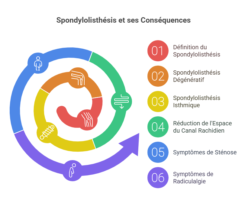Conséquences : Dans les deux cas, le glissement vertébral peut entraîner un rétrécissement du canal rachidien central et des foramens, provoquant des symptômes de sténose (douleurs dans les jambes à la marche) et/ou de radiculalgie (douleur de type sciatique).