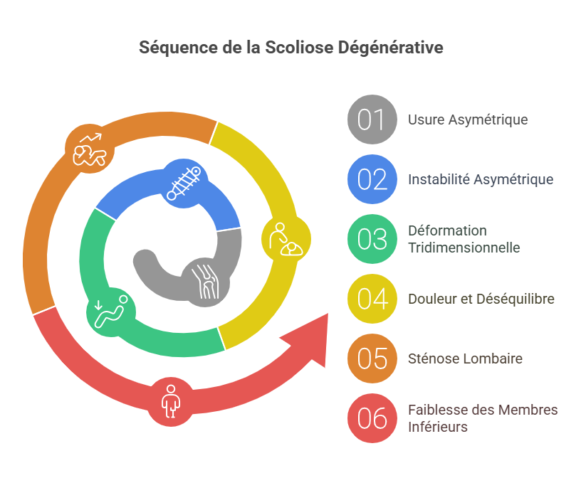Mécanisme : Son origine réside dans une usure asymétrique des composants de la colonne. Un disque qui s'affaisse plus d'un côté que de l'autre, ou une arthrose facettaire plus prononcée d'un côté, va créer un « pincement » latéral. Cette instabilité asymétrique conduit progressivement à une déformation complexe en trois dimensions : une courbure latérale (visible de face) et une rotation des vertèbres sur elles-mêmes.22