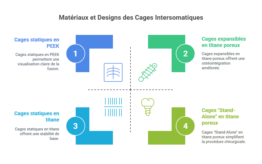 ALIF, PLIF, TLIF, XLIF et LLIF, selon la voie d'abord (antérieure, postérieure, latérale).