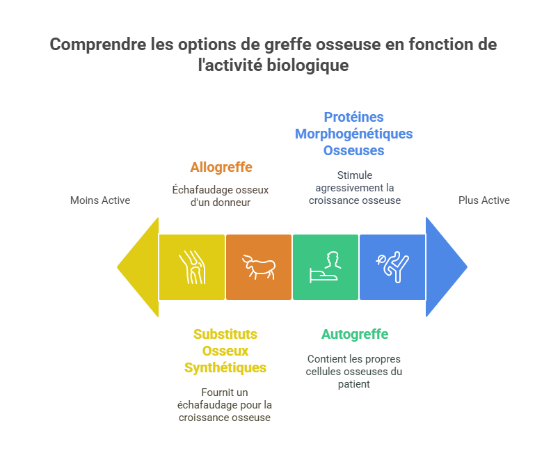 Os autologue (du patient), allogreffe ou substituts osseux synthétiques sont utilisés selon les cas.