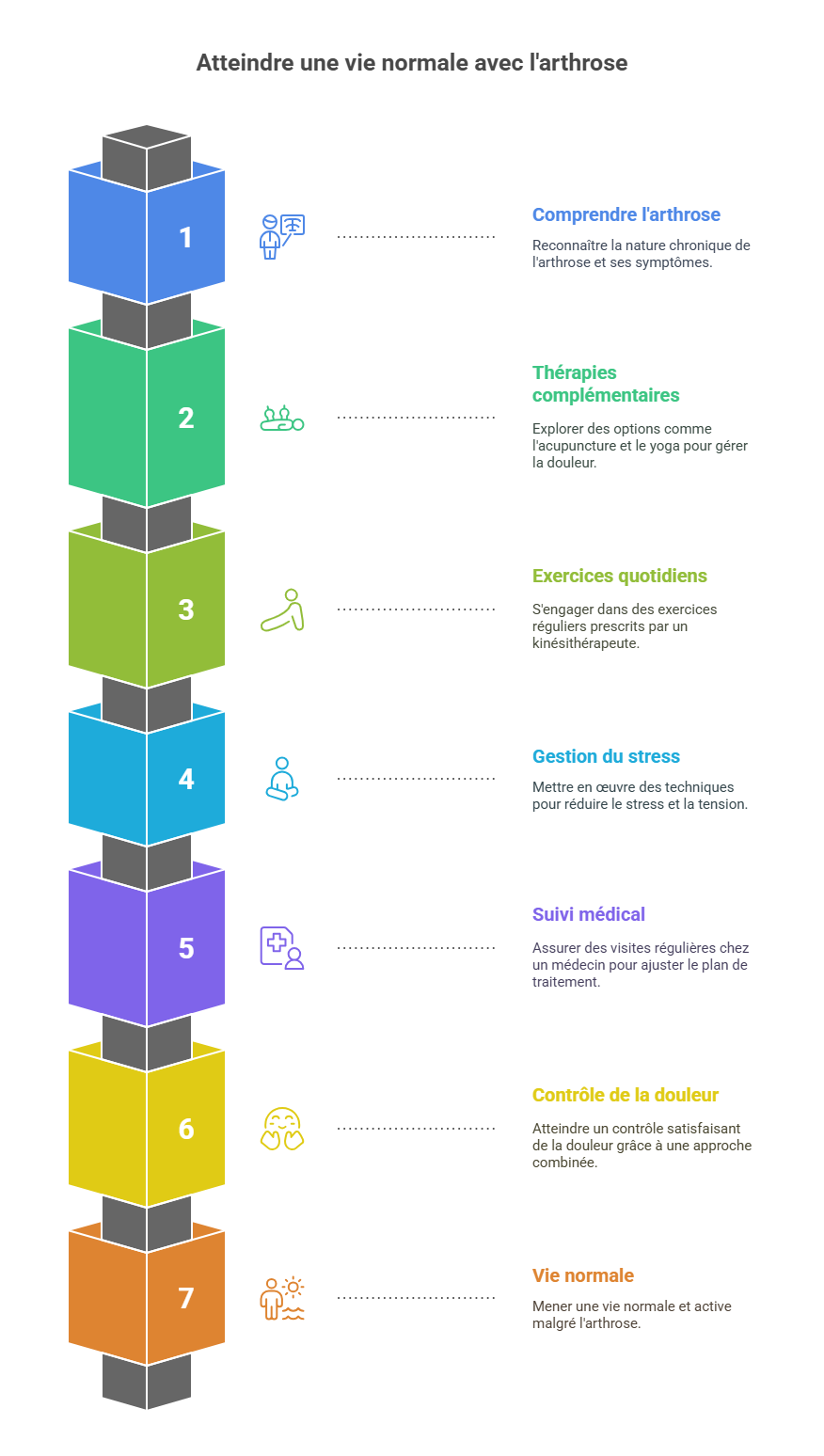 Impact sur la vie quotidienne : Une arthrose facettaire sévère peut devenir très invalidante. Les douleurs chroniques limitent la capacité à marcher longtemps, à rester debout, à porter des charges ou à effectuer des mouvements du dos. Le sommeil peut être perturbé. La personne peut réduire ses activités, éviter le sport et craindre les mouvements, entrant dans un cercle vicieux de déconditionnement physique. Il est important de rassurer les patients : de nombreuses solutions existent pour soulager l'arthrose facettaire. On privilégiera d'abord les traitements conservateurs (non chirurgicaux). Ensuite, seulement en cas d'échec ou de complications neurologiques, une prise en charge chirurgicale pourra être envisagée, avec aujourd'hui des techniques innovantes visant à préserver la mobilité de la colonne.